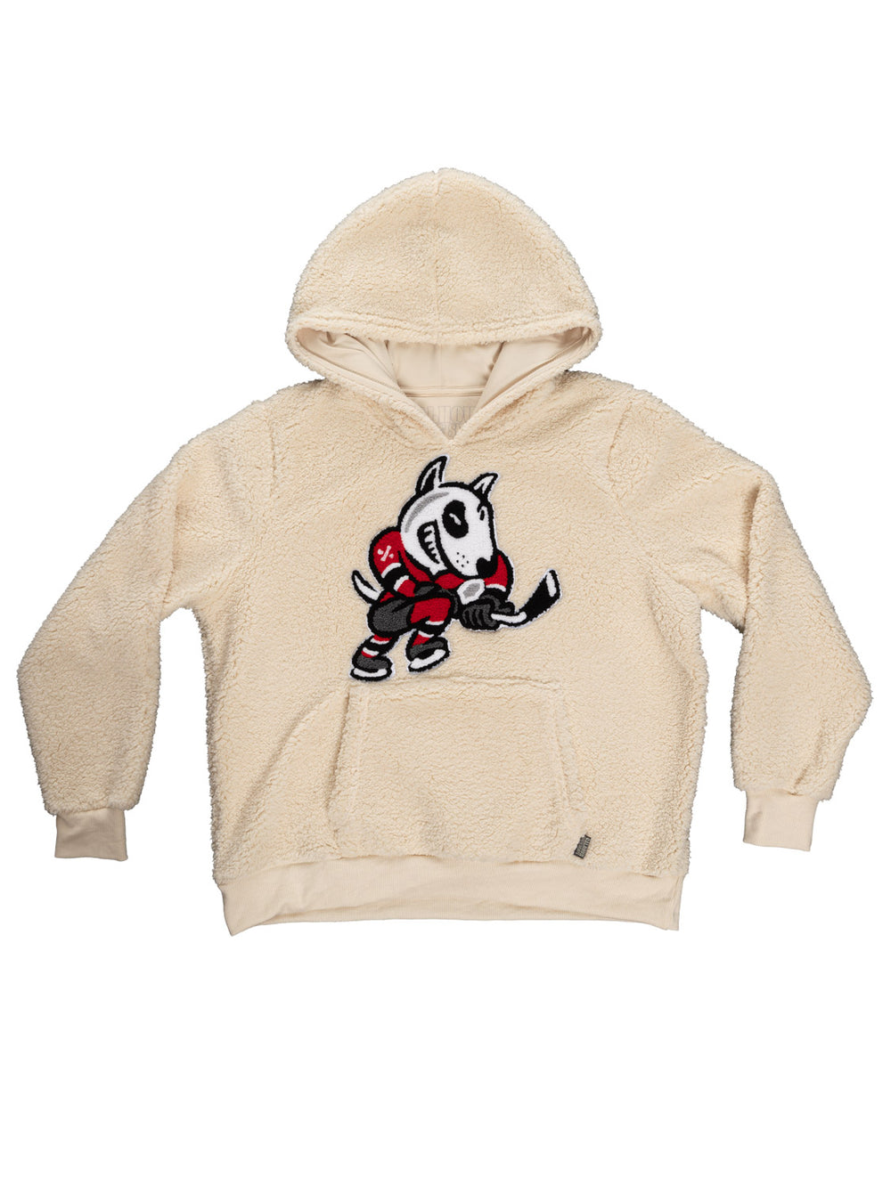 Hey Ice Dog fans! Looking for a hoodie to keep you warm while watching the Niagara Ice Dogs? This Ladies' Sherpa Hoodie is a perfect game day look. Featuring a chenille logo that makes Bones the star of the hoodie, this will become your go to hoodie for attending a game, running errands or lounging at home!